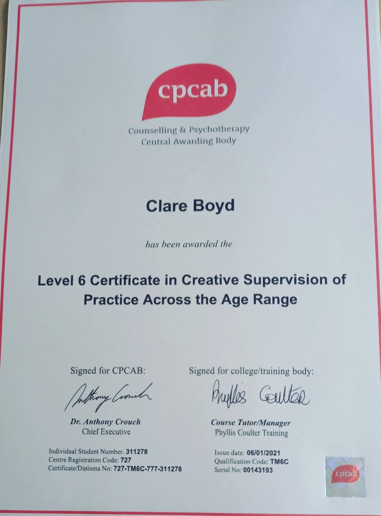 I have completed my level 6 certificate in Creative Supervision of Practice across the age range and can offer Creative Supervision either face to face or via Zoom video meetings.